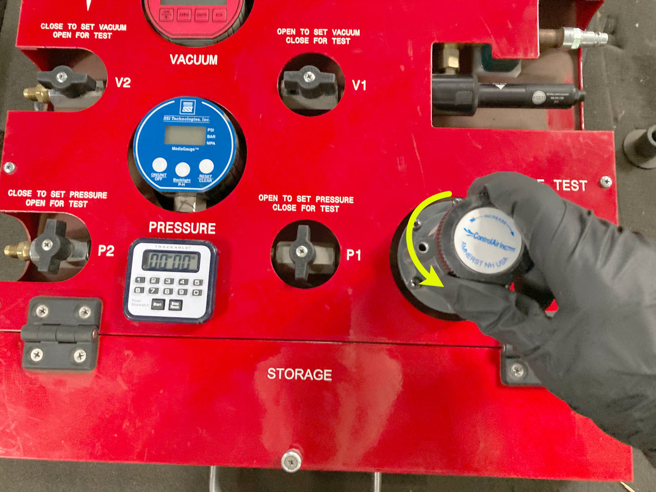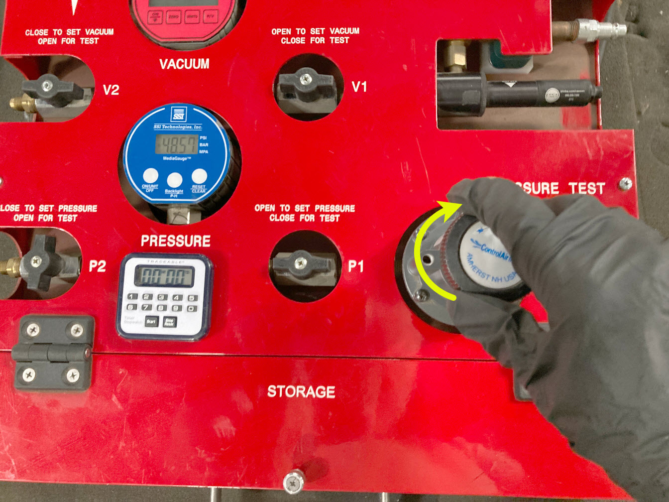 - Turn valve P1 (inlet) counter-clockwise to open, and allow the air to bleed of f.