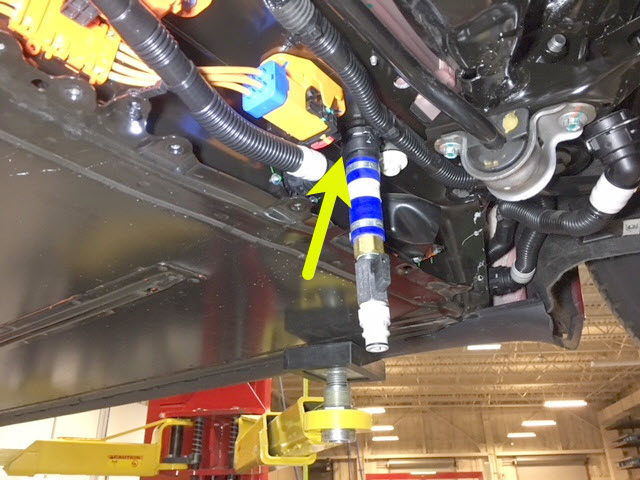 - Remove the plug from the rear powertrain supply hose, connect the hose to the male fitting on the RH underside of the ancillary bay, fasten the clip, and then perform a Push-Pull-Push test of the fitting.