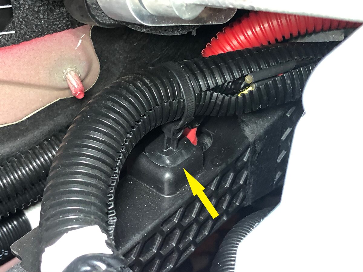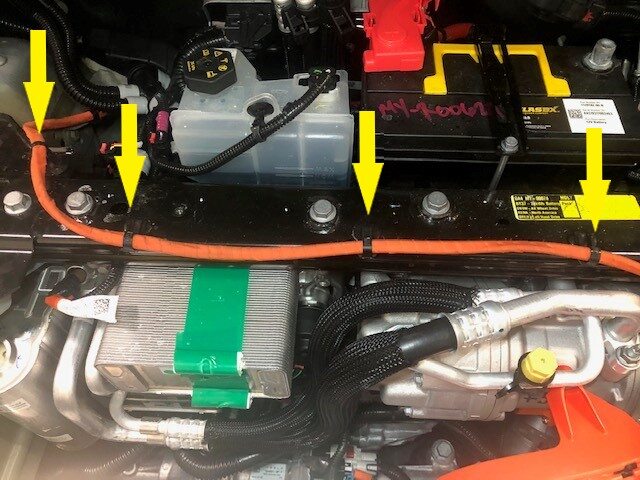the A/C compressor HV harness to the shock tower support brace.