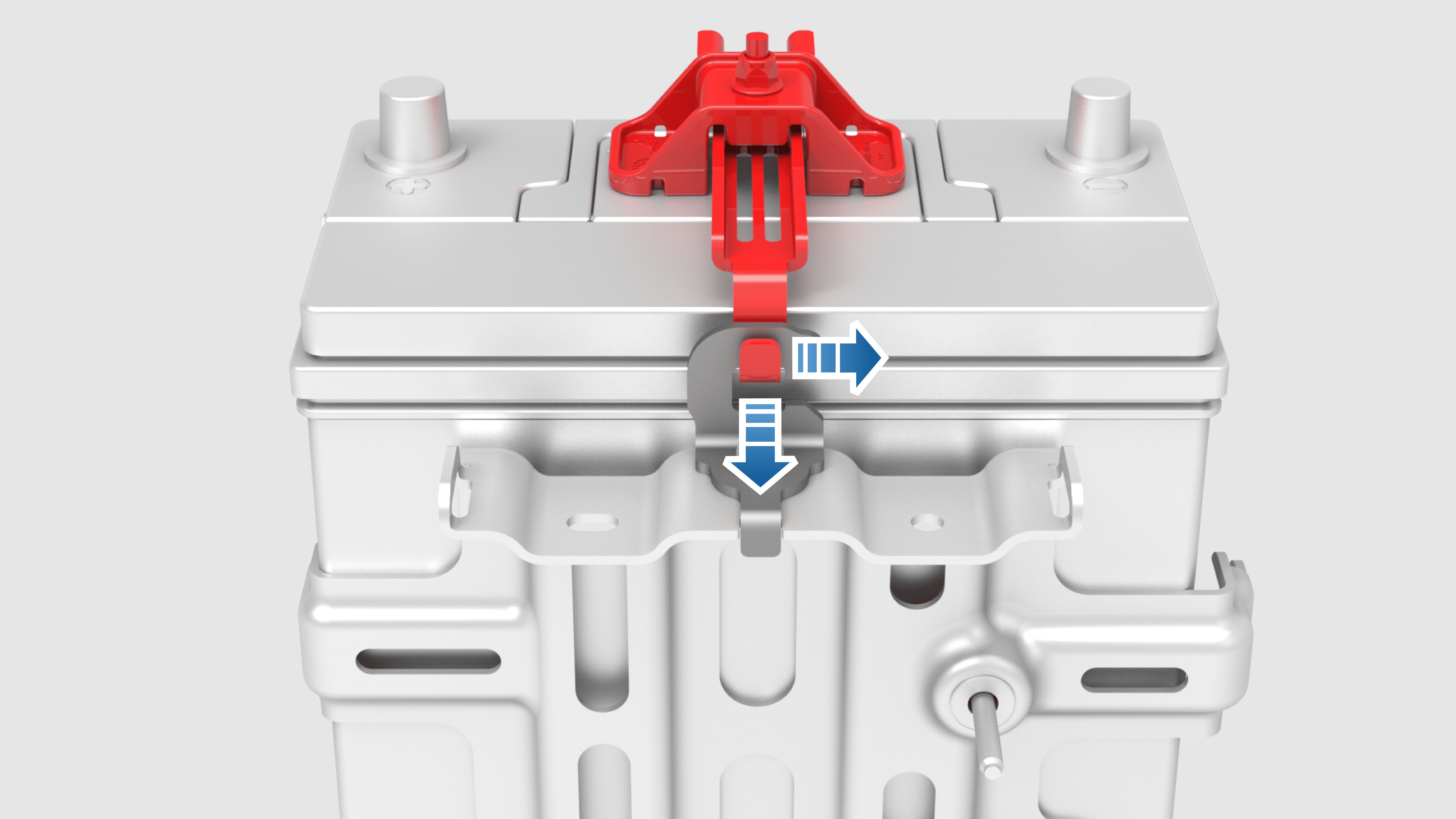 - Push down and slide the 12V battery strap to the right to release it from the front hook and rear tie down assembly.