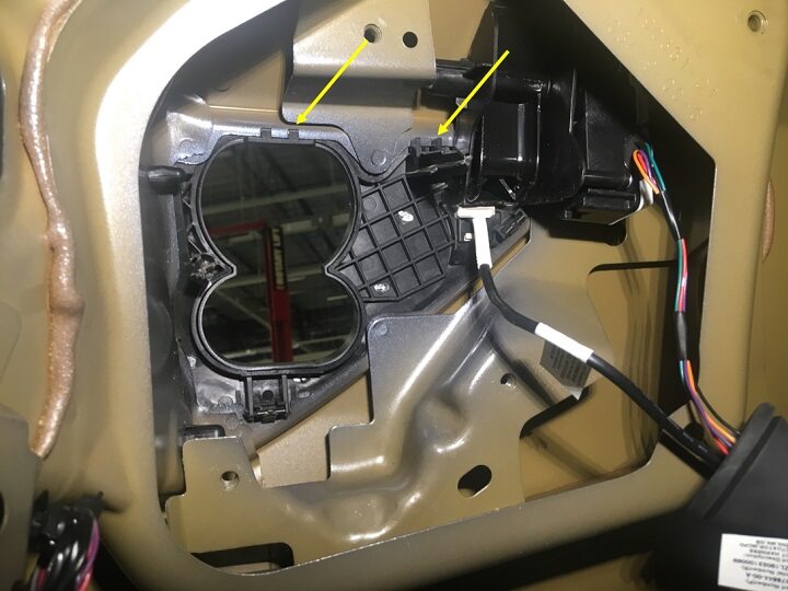 NoteTabs (x2)NotePull the charge port door assembly towards the rear of the vehicle. When the door actuator reaches the rear of the quarter panel, pull the charge port door down to clear the actuator mechanism, and then pull out and away from the body.NoteManipulation the charge door assembly may be necessary to fully remove the assembly from the vehicle.