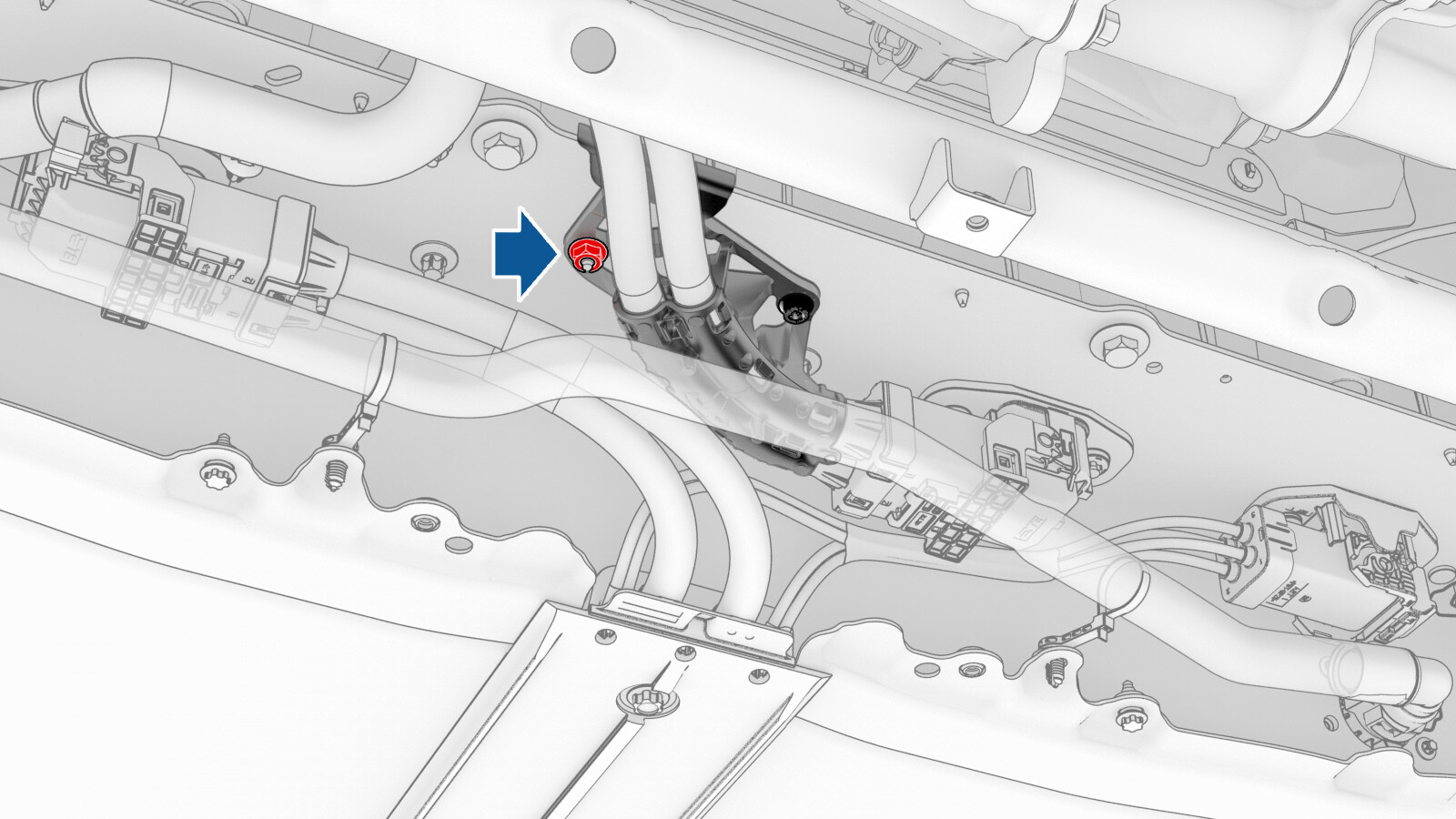 - Fasten the barrel clip that attaches the rear drive unit inverter inlet hose to the HV battery.