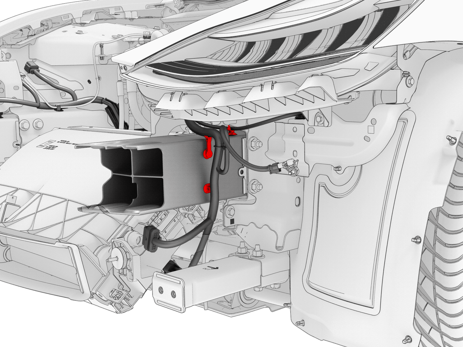- Release the clips (x3) that attach the electrical harness to the LH front crush can.