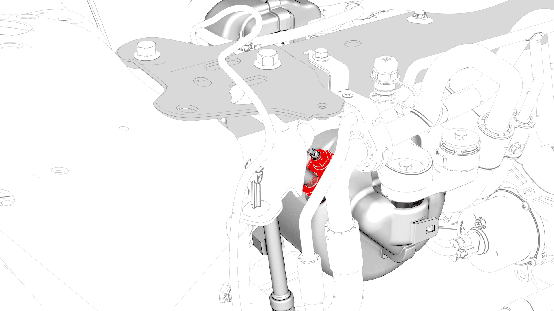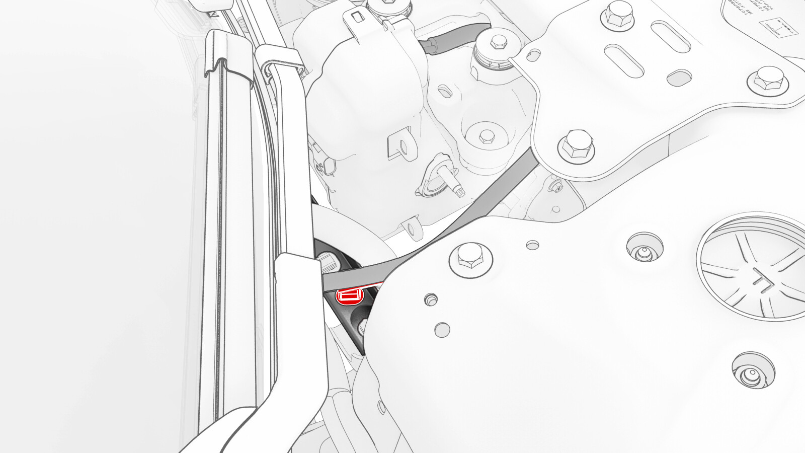 Install the suction/liquid line bracket onto the shock tower brace, and then install the bolt that attaches the bracket to the brace.