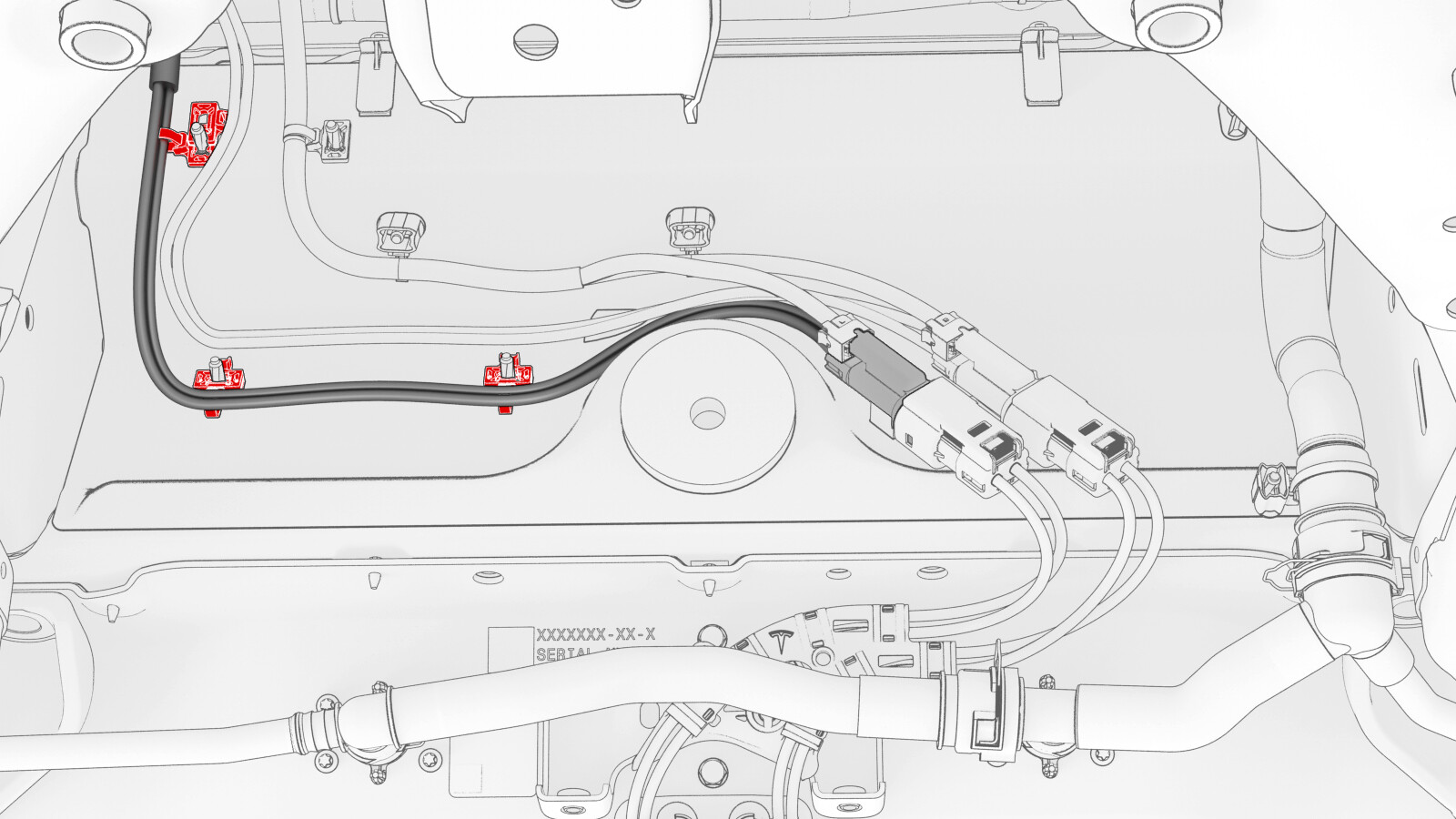 - Release the clip that attaches the compressor HV electrical harness to the crossbeam.