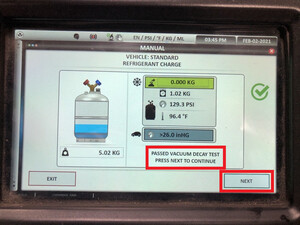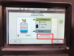 NoteRecharge refrigerant to 1.02 kg (1020g), For Robinair AC machines press ESC to NOT ACCEPT the step to clear out residual oil, Once complete press next to start End of Charge process