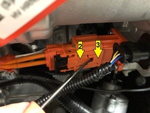 Note4x clips, 1x connector, Frunk safety switch, 3x guide tabs, Align the 3x tabs then push downward to secure clips