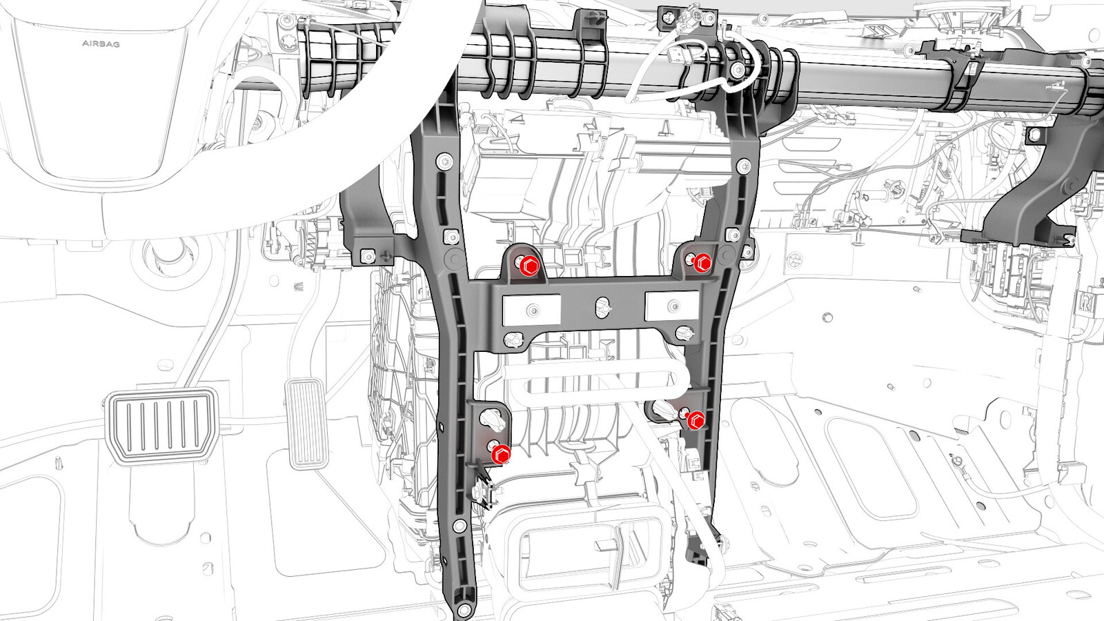 - Remove the bolts (x4) that attach the cross car beam to the HVAC assembly (torque 5.5 Nm).