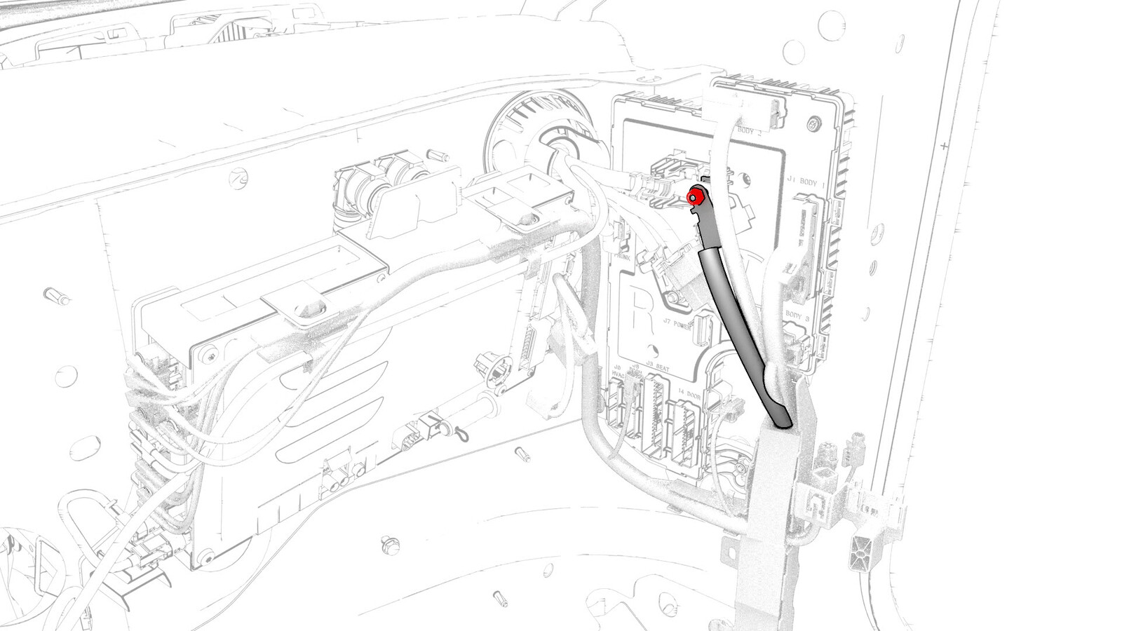 - Remove the nut that attaches the electrical harness ground strap to the RH body controller module, and then remove the ground strap from the module.