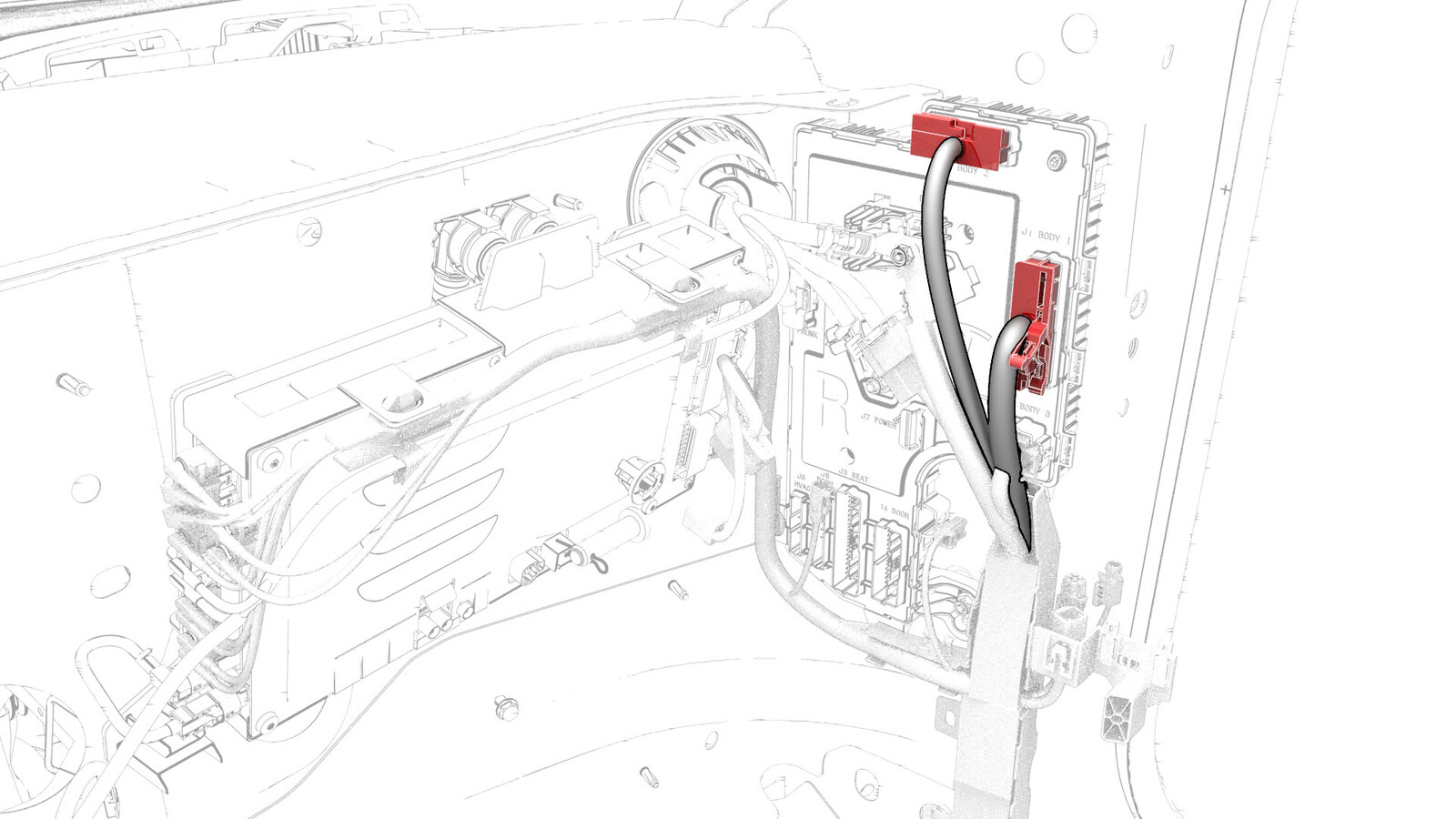 - Disconnect the electrical harness from the RH body controller module connectors.