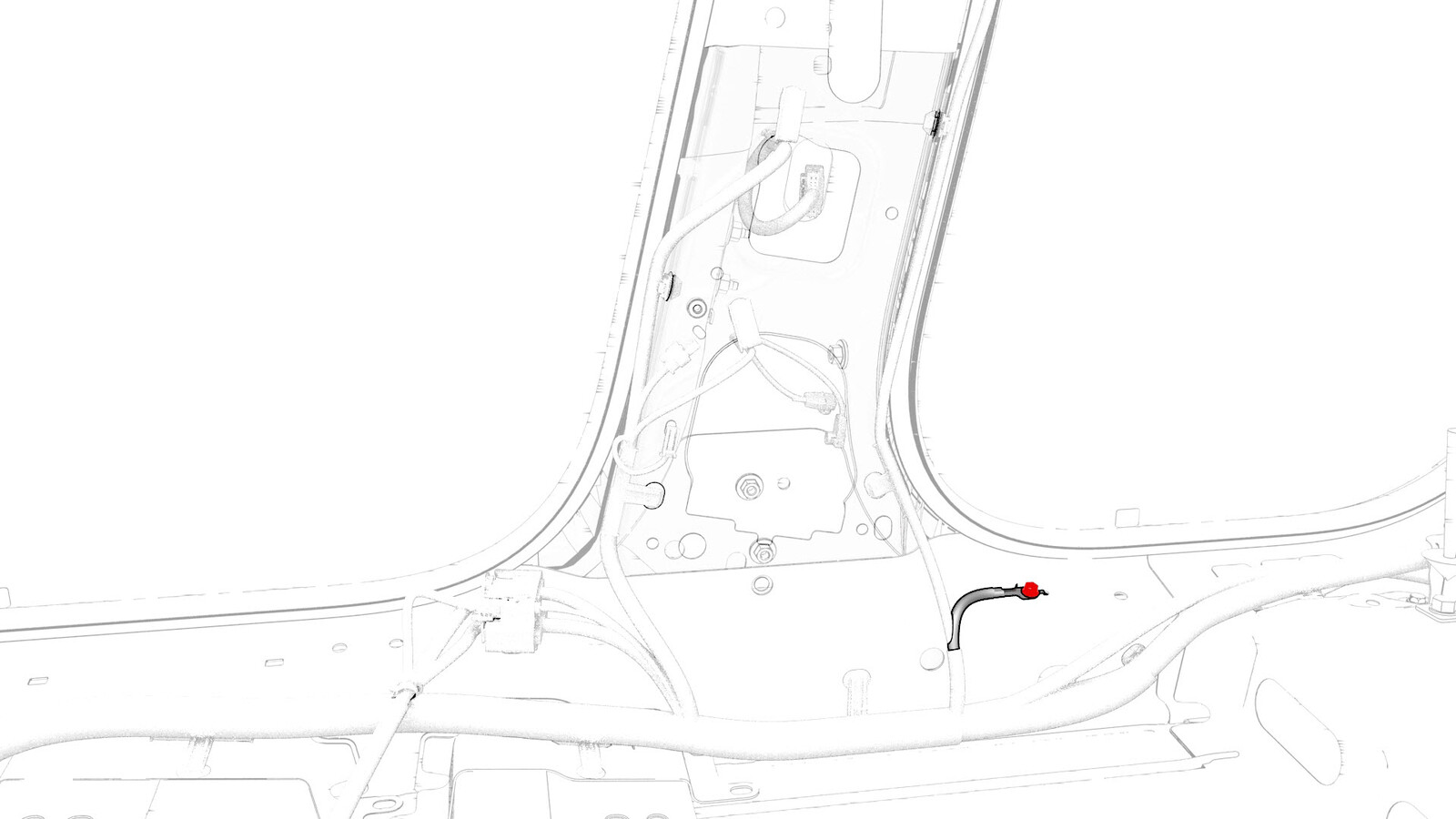 - Remove and discard the bolt that attaches the electrical harness ground strap to the body in the lower B-pillar area.