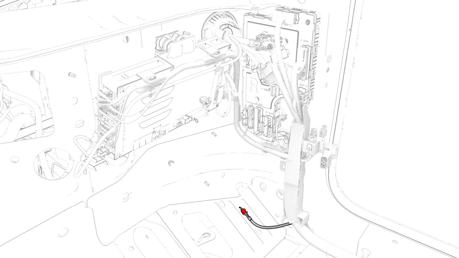 - Remove and discard the bolt that attaches the electrical harness ground strap to the body in the passenger footwell area.