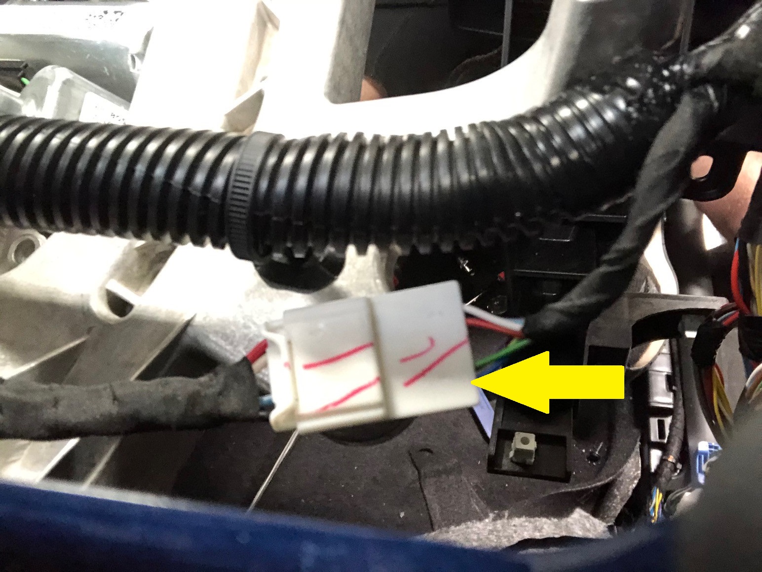 - Remove the instrument panel harness from the center console area, and then move it aside.