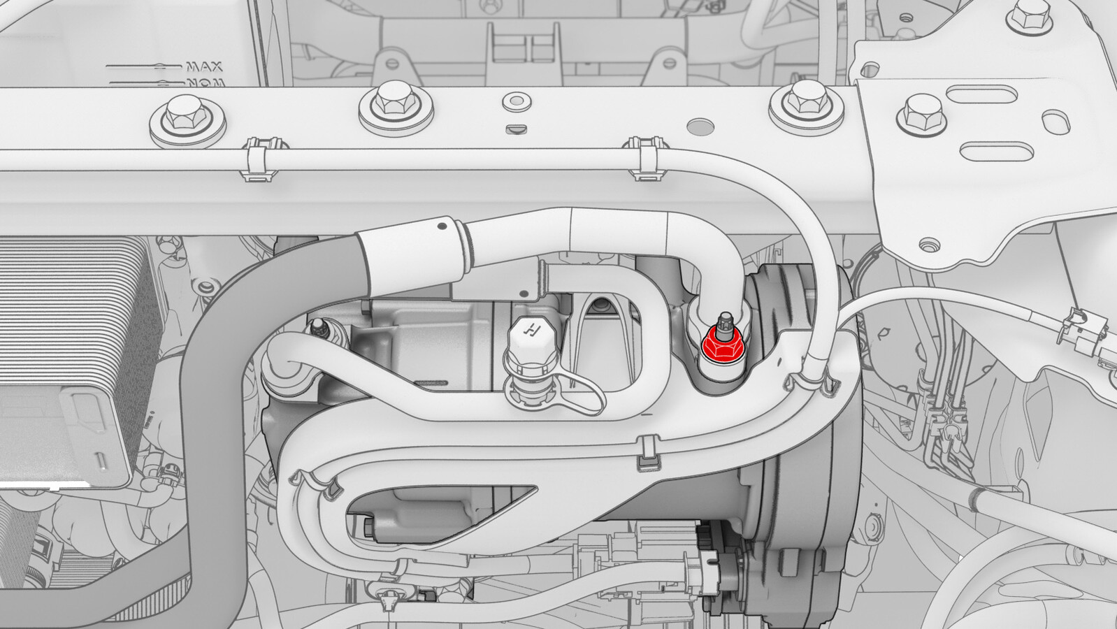 | Nut that attaches the high pressure pipe to the A/C compressor |