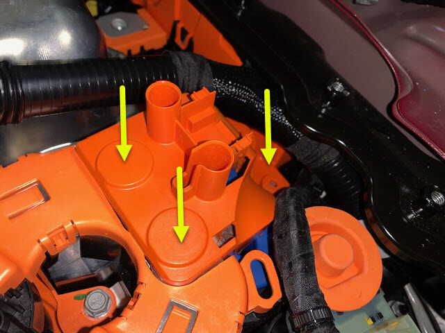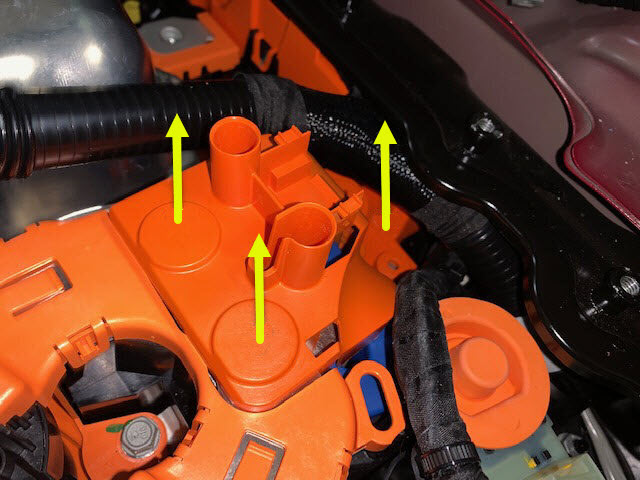 - Move the HV battery negative contactor harness to the side, and then lift straight up on the HV battery probing guide to remove it from the ancillary bay.