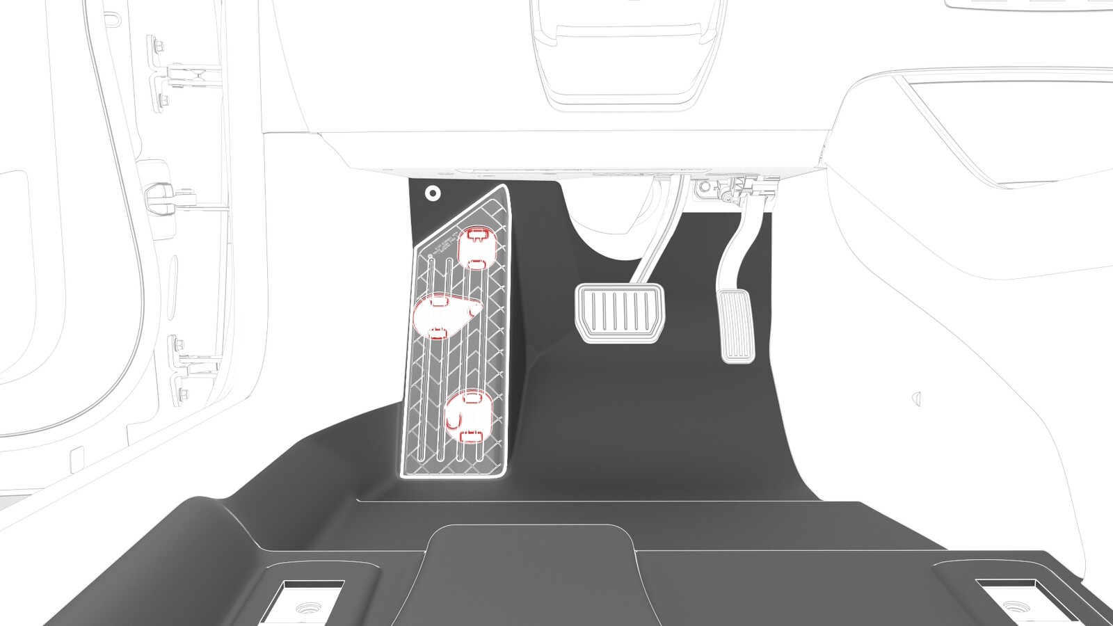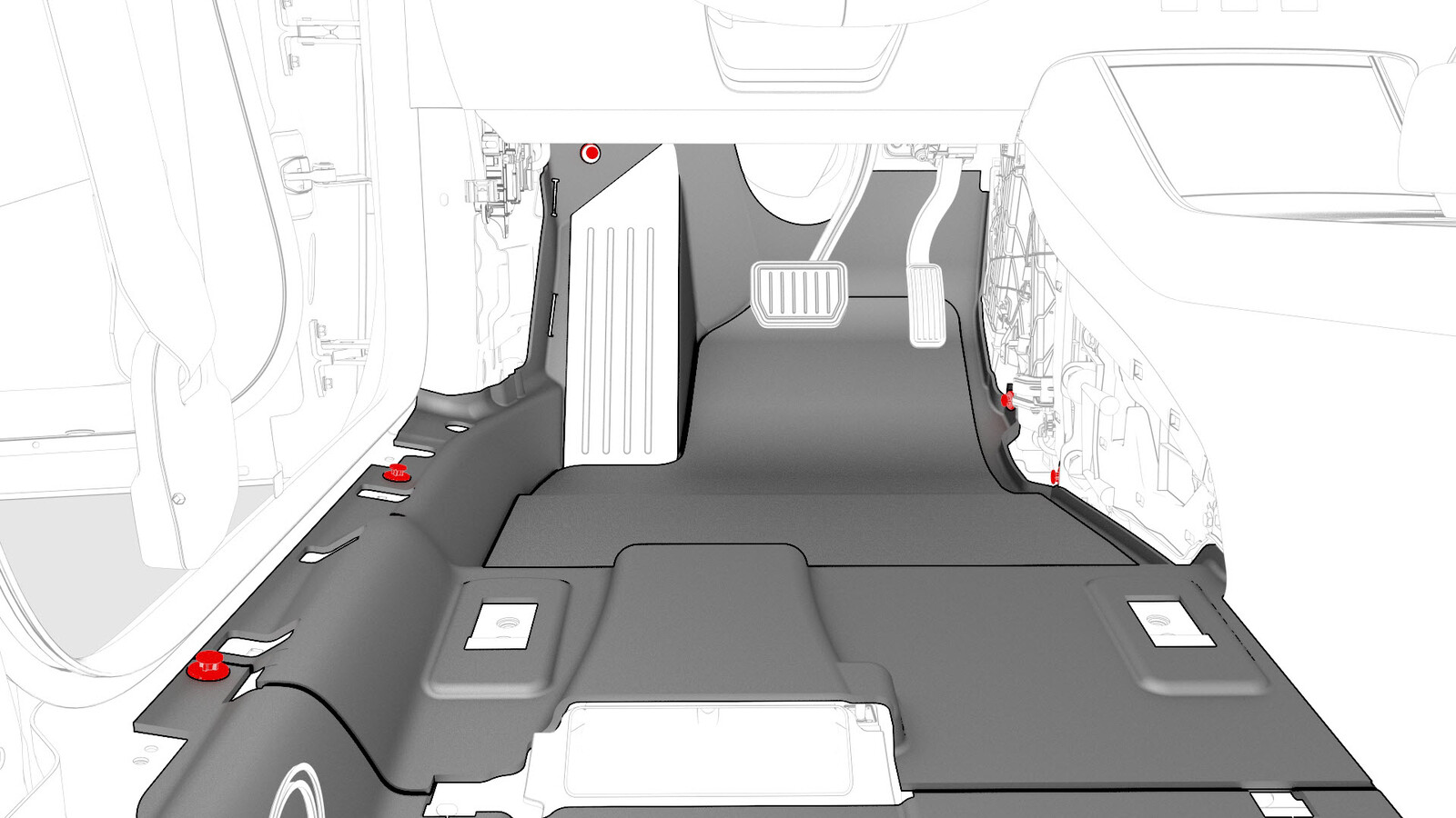 - Install the LH front carpet into the vehicle and fasten the clips that attach the driver footrest to the body.