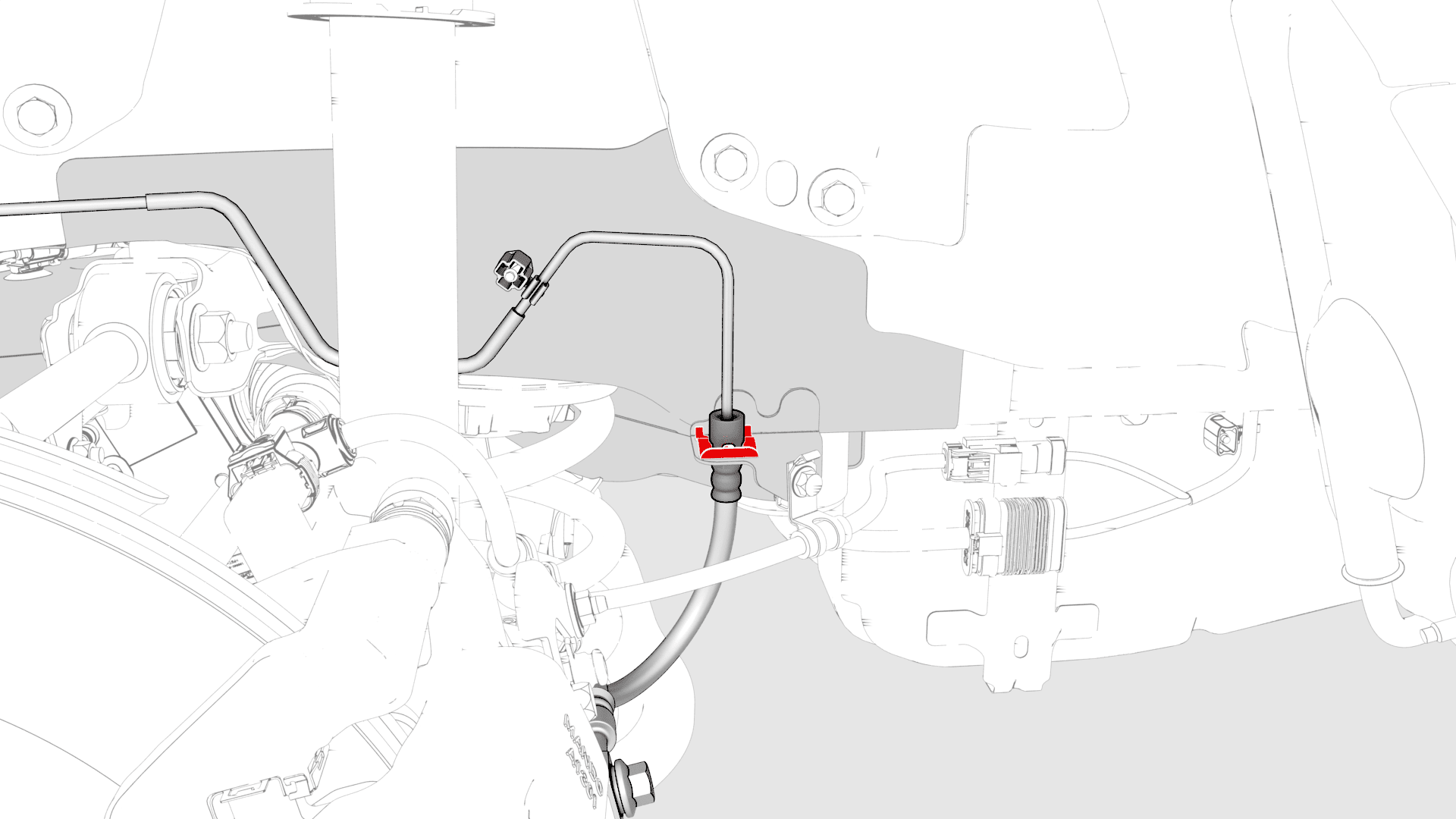 42 Nm (31.0 lbs-ft)NoteThe bolt and washers are captive in the new hose assembly. - Install the brake hose into the jounce hose bracket, and then fasten the clip that attaches the hose in the bracket.