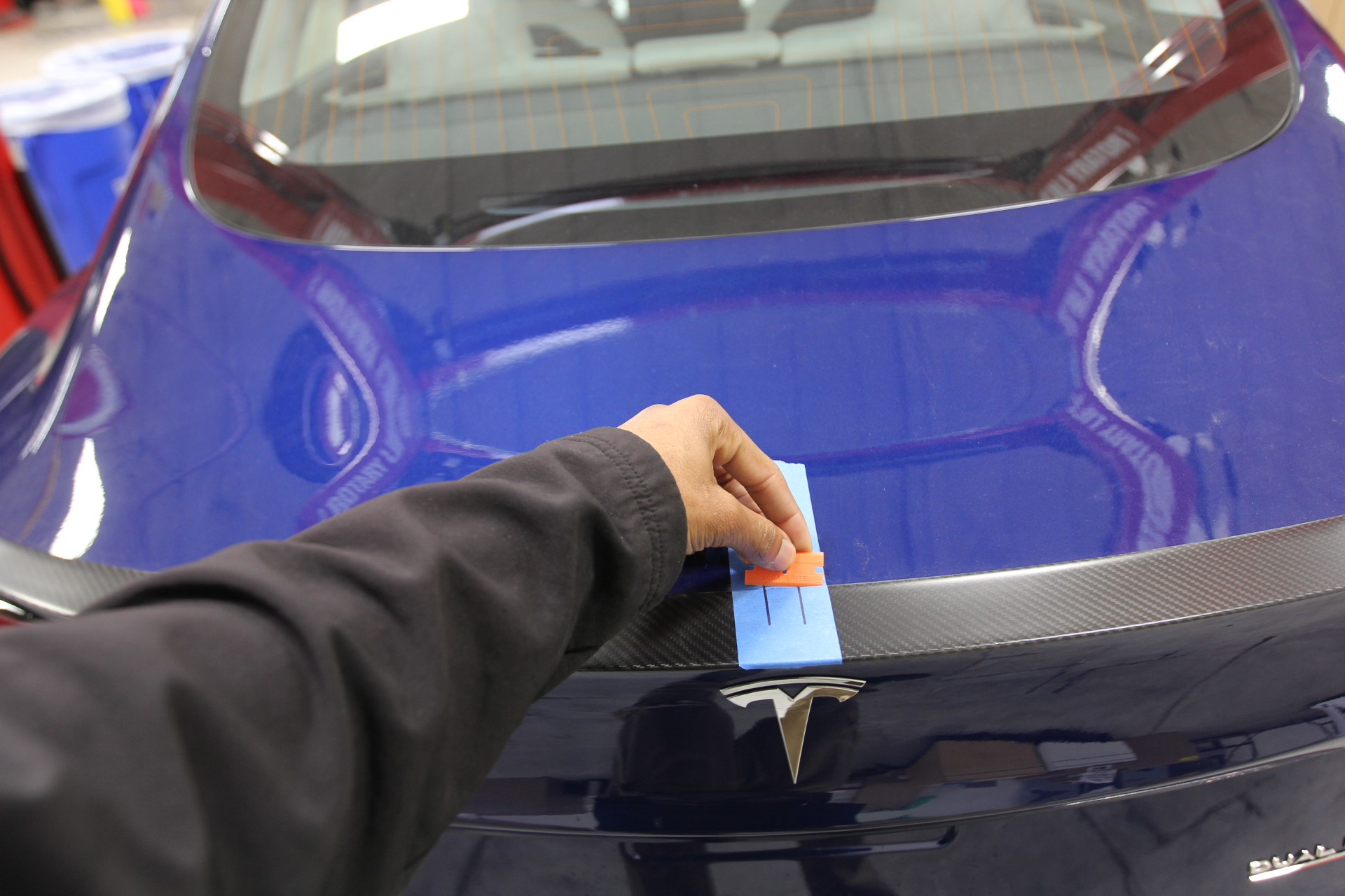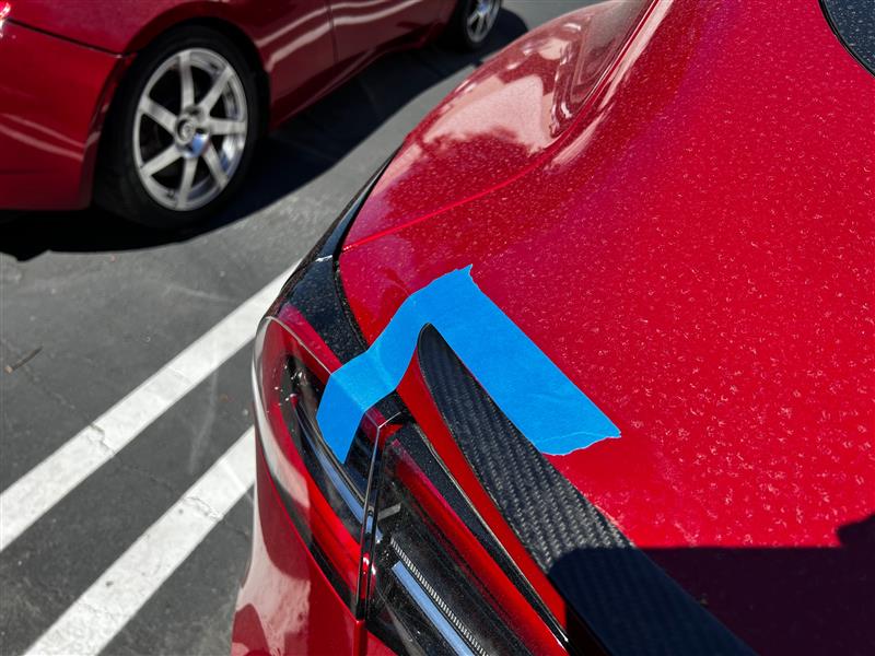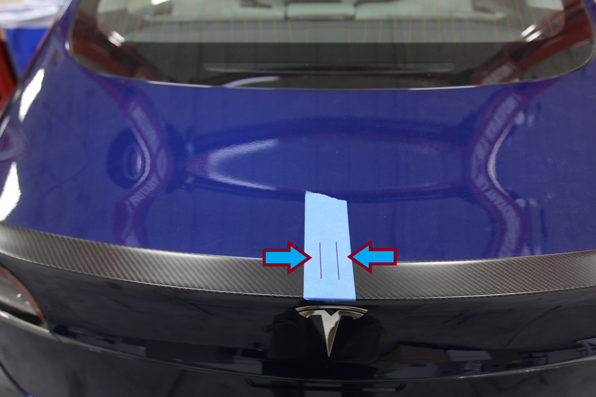 Apply masking tape to the center of the rear spoiler and trunk, and then