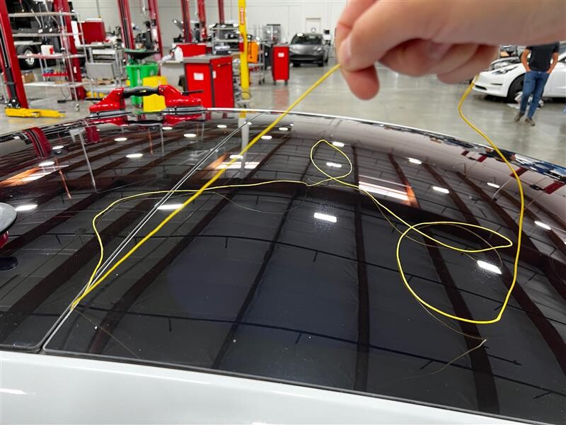Secure the line to the starter tool and push the tool through the urethane at the LH rear corner of the fixed roof glass assembly.