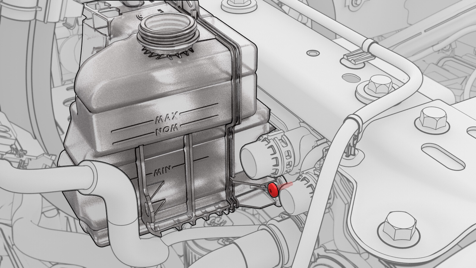 - Position the evacuation hose in the front LH corner of the coolant bottle, and then evacuate as much coolant as possible.