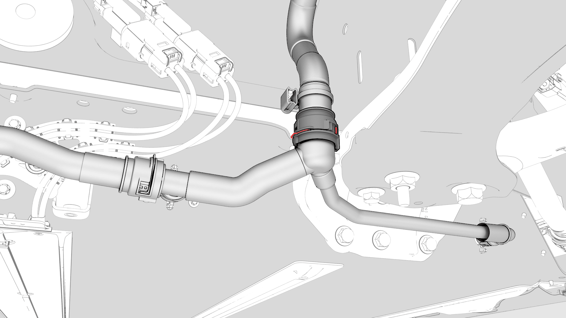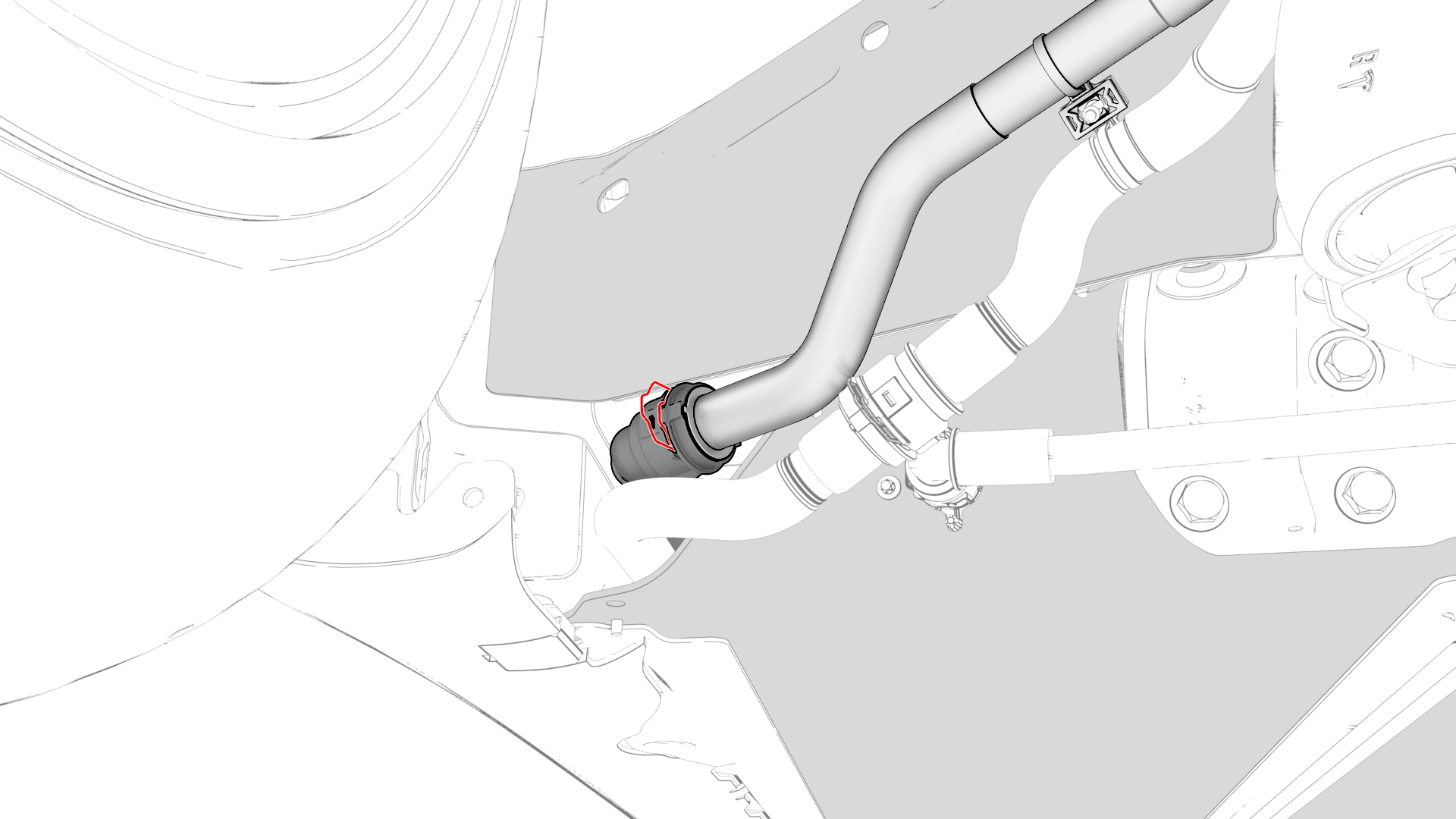- Release the spring clip to disconnect the powertrain return hose at the RH side of the vehicle, and then plug the female side of the hose.