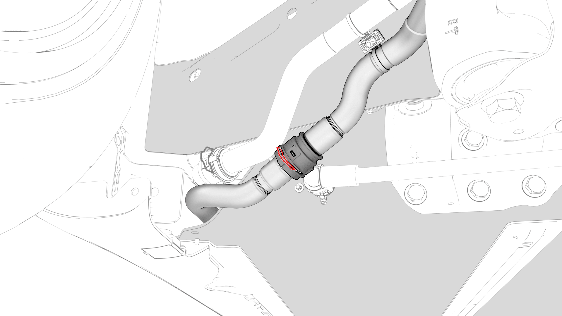 - Release the spring clip to disconnect the rear powertrain supply hose at the RH side of the vehicle, and then plug the male side of the hose.
