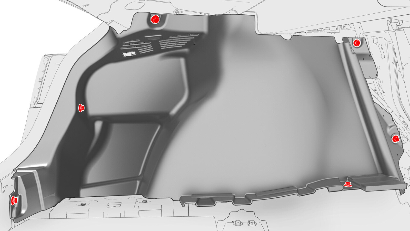 - Release the push clips that attach the LH trunk side trim to the vehicle.