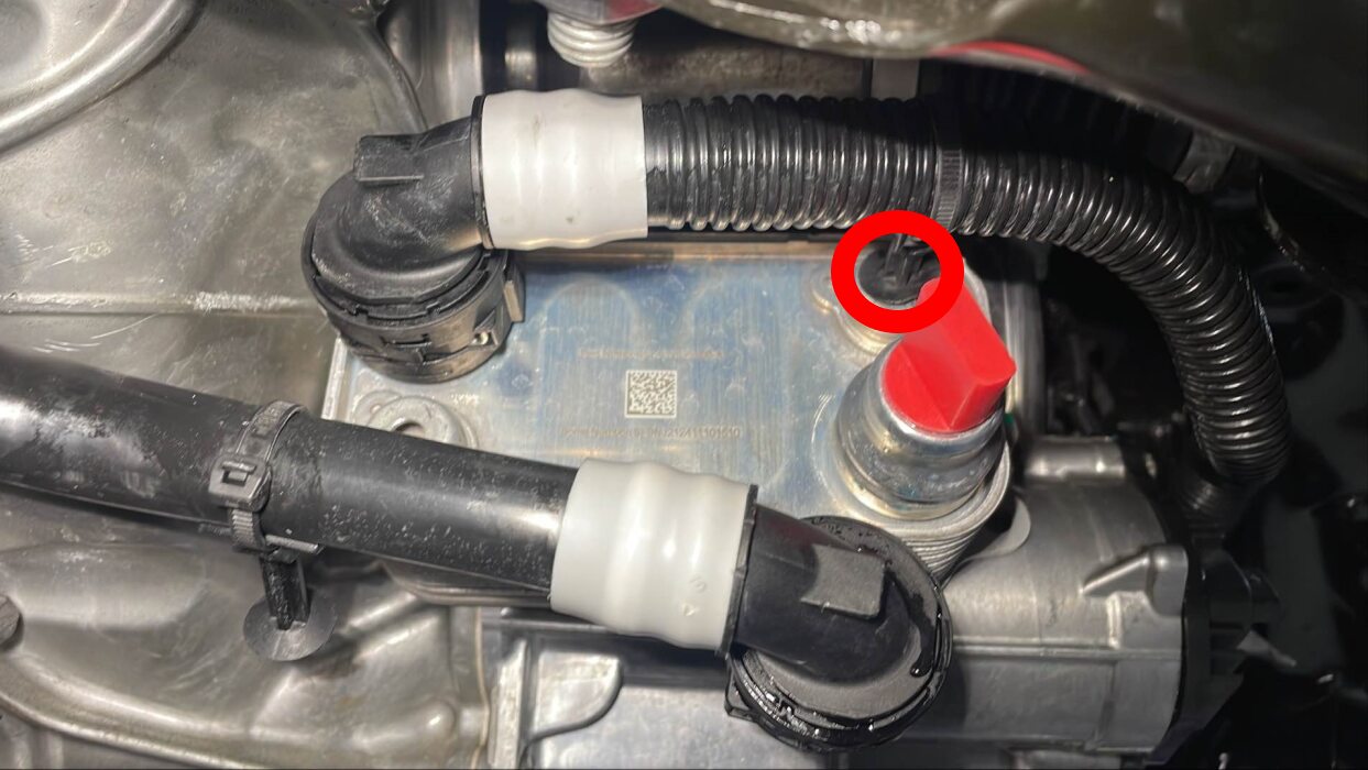 - Fasten the clip that attaches the rear drive unit inverter to heat exchanger hose to the rear drive unit heat exchanger.