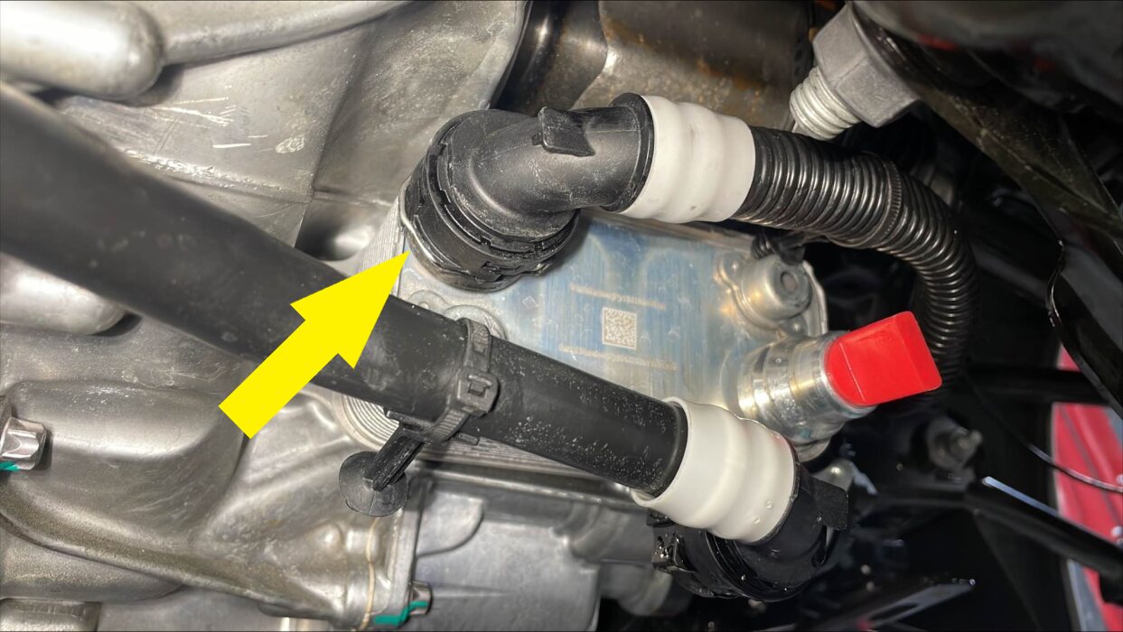- Release the clip that attaches the rear drive unit inverter to heat exchanger hose to the rear drive unit heat exchanger.