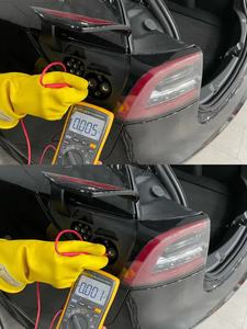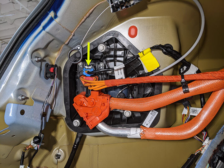 NoteMake sure to wear PPE (HV gloves, safety glasses) when working on high voltage component, Be sure to place the positive test lead on the side of the HV pin just past the plastic protective covers Measure the the voltage between B+ (the four dead front pins) to B- (rear left door striker as a ground for the isolation check), If voltage is greater than 10V, pack contactors are not open or welded, Stop work and reach out to Service Engineering.