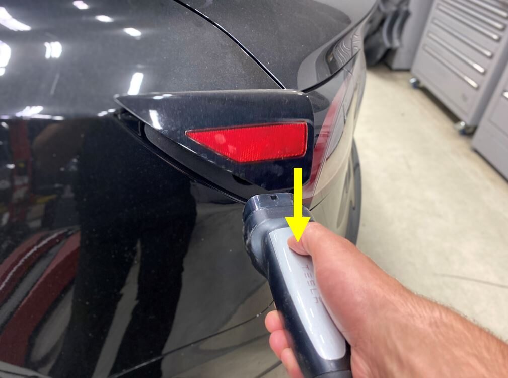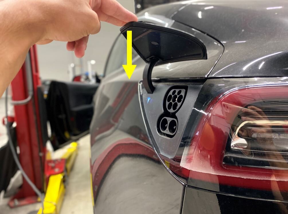 NoteUse customer's charging equipment if available, lightly push on the lower corner of CP door, once opening is confirmed then close the door, press the button on the charge handle, there can be brief time out once CP door is open confirm vehicle is charging by connecting charge handle to the vehicle, disconnect charge handle and confirm CP door closes, ensure all charging adapters are present
