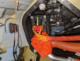 NoteMake sure to wear PPE (HV gloves, safety glasses) when working on high voltage component, Be sure to place the positive test lead on the side of the HV pin just past the plastic protective covers Measure the voltage between B+ (the two dead front pins) to B- (rear left door striker as a ground for the isolation check), If voltage is greater than 10V, pack contactors are not open or welded, Stop work and reach out to Service Engineering.