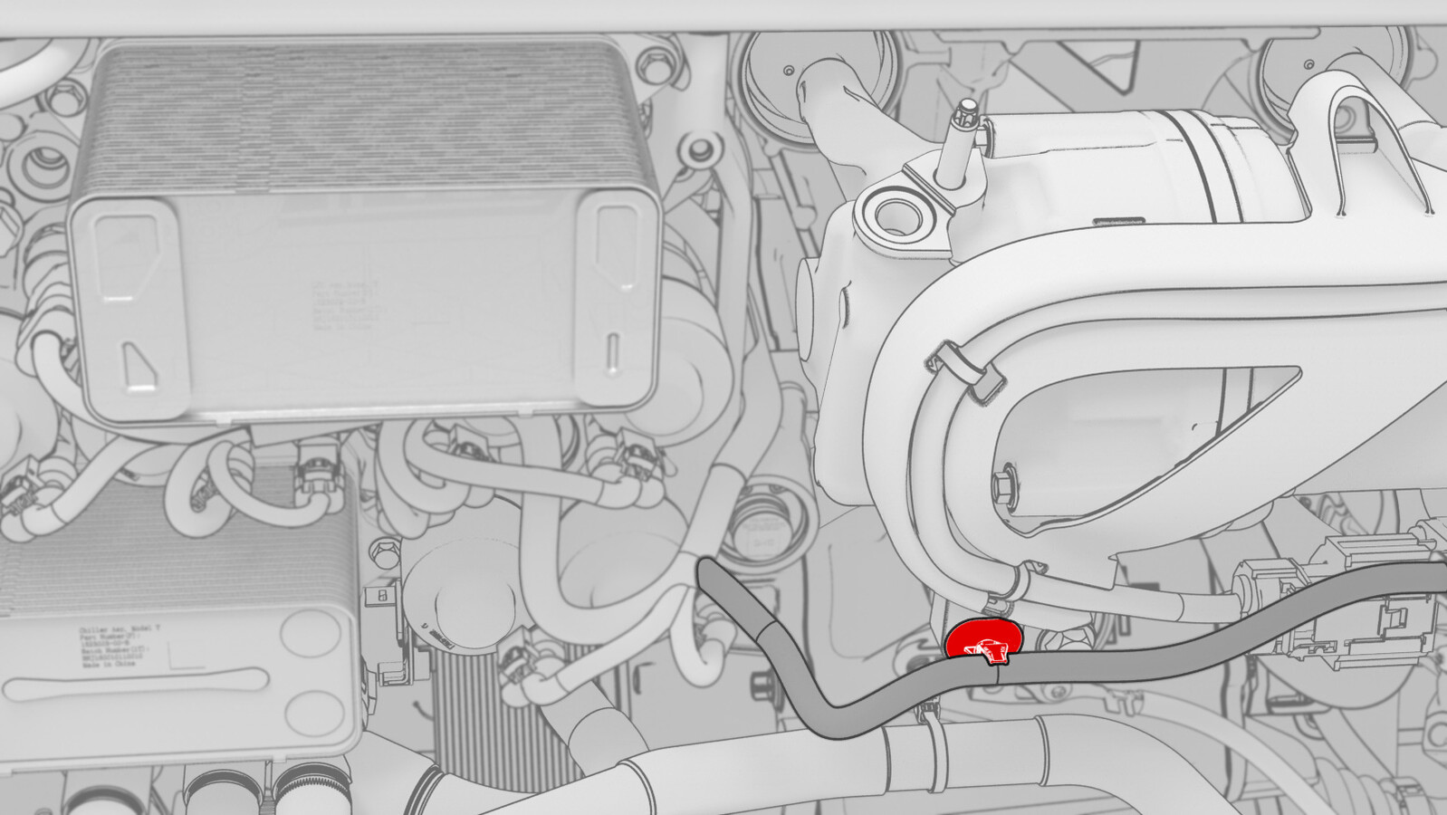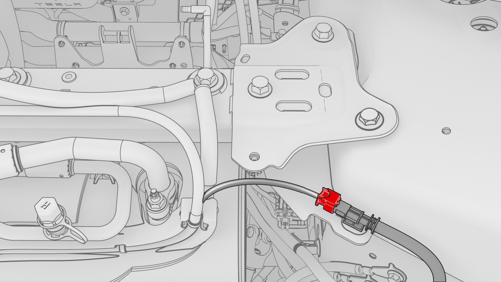 - Release the clips (x2) that attach the coolant hose to the 12V battery bracket.
