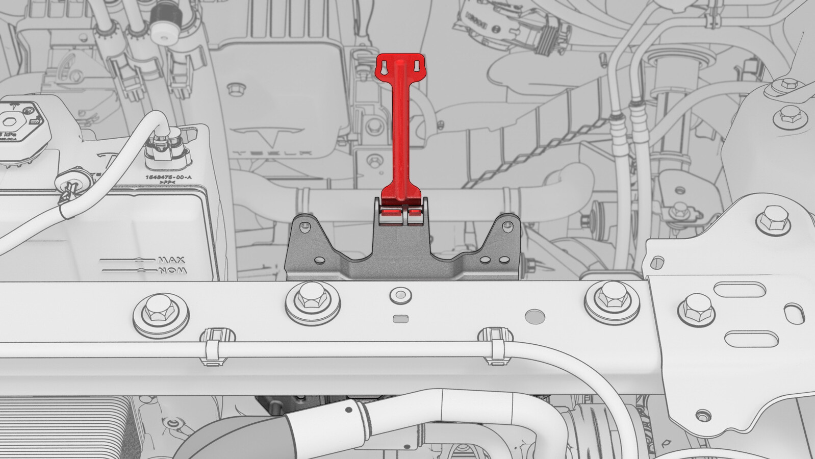- Install the clip that attaches the 12V battery vent tube to the 12V battery bracket.