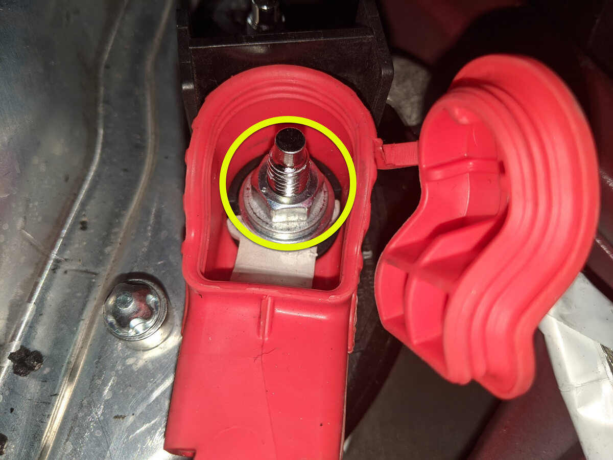 CAUTIONMake sure the positive output cable is positioned properly and in the right direction against the plastic anti-rotation edge on the DCDC passthrough.Note1x nut, 13mm, 9 Nm, Install new nut, Mark the nut after torque, Make sure rubber boot is not pinched between cable terminal and pass through