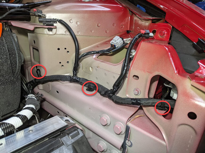 Note4x clips, 1x connector, Frunk safety switch, 3x guide tabs, Align 3x tabs then push downward to secure clips