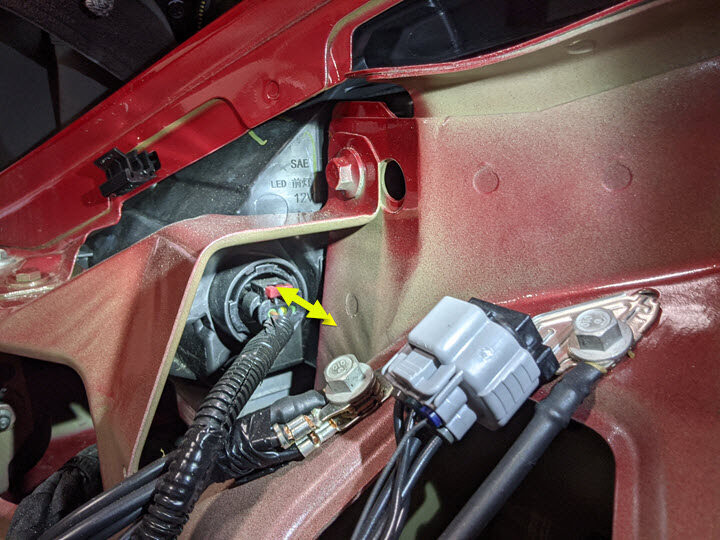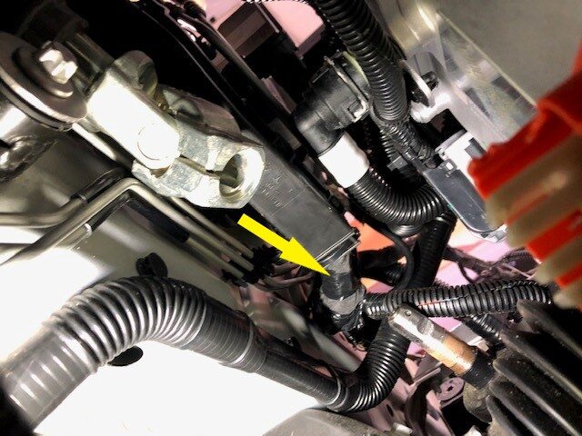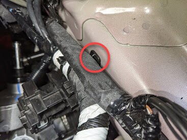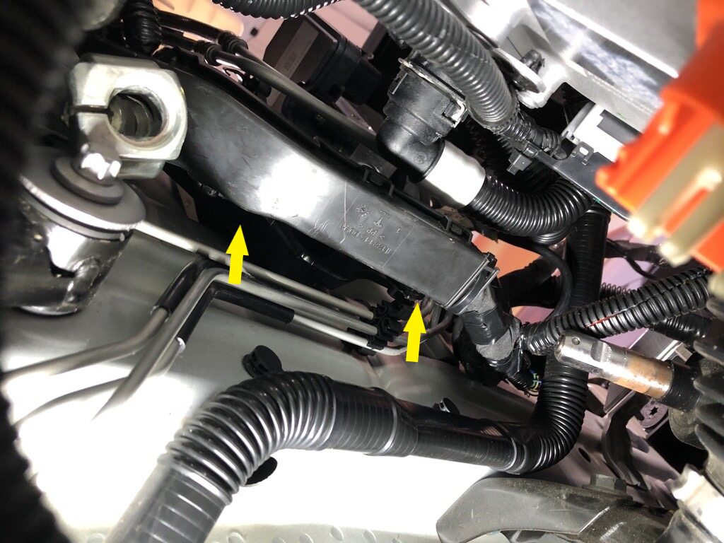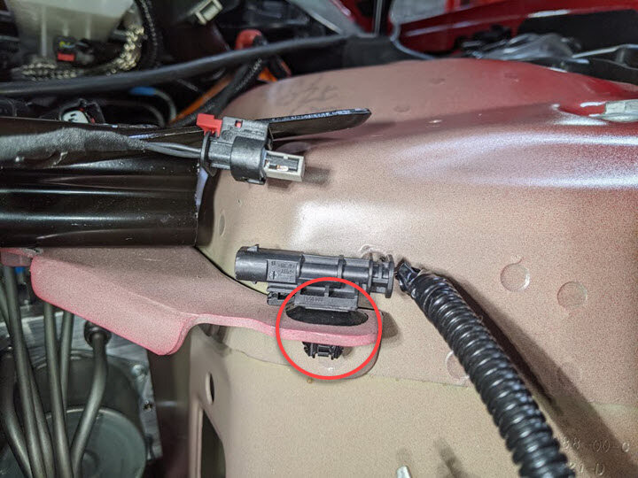 Note1x connector, Red locking tab, Release lock from opposite side of bracket then release connector towards front of vehicle, Image zoomed in for clarity