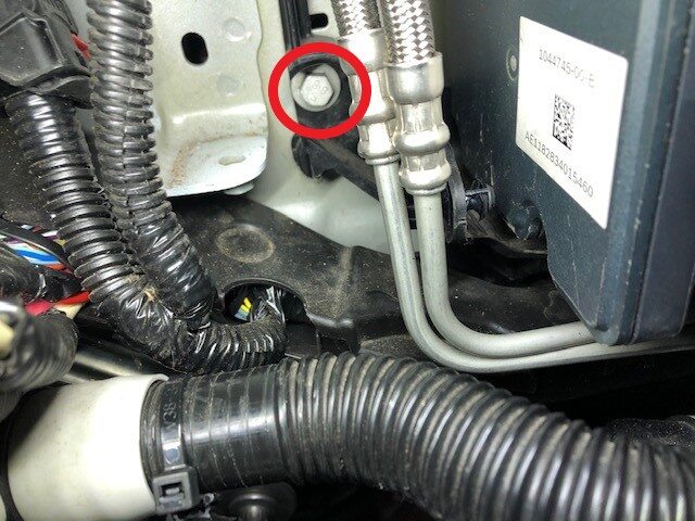 Note1x bolt, 10mm, 5 Nm, Lift battery tie down strap up and remove it from rear tie down hook strap