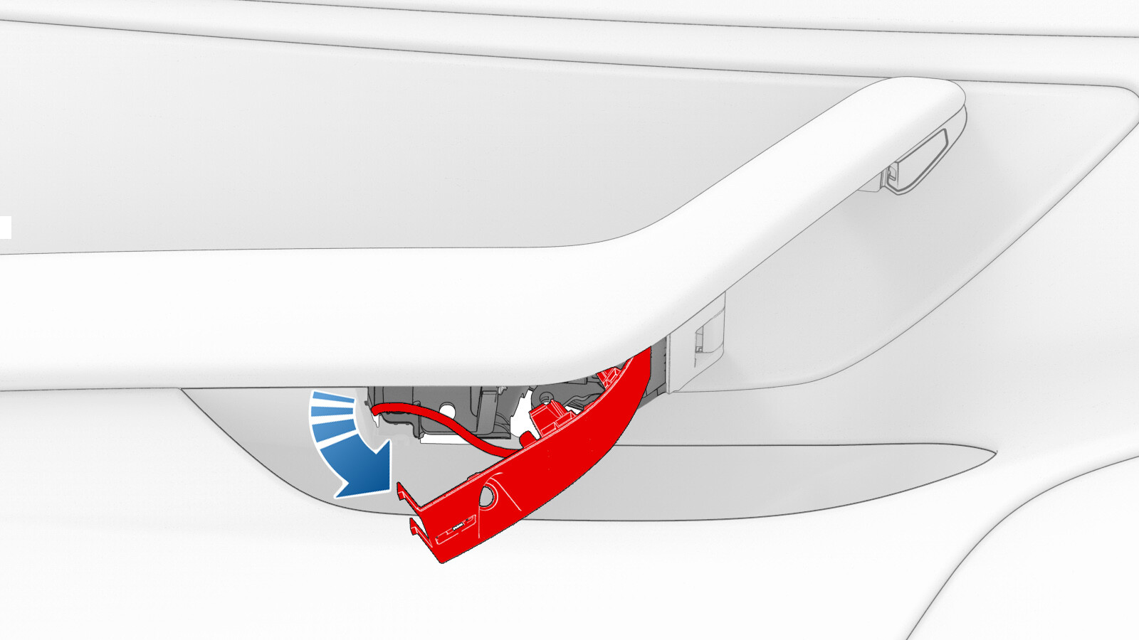 - Hook the front edge of the bolt cover to the door panel, move the puddle light harness into the door panel, and then pivot the bolt cover up and secure the clips (x7).