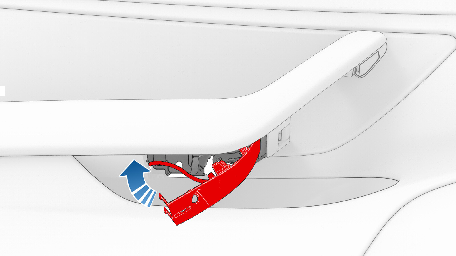 CAUTIONReplace door trim if any tabs are broken during removal.NotePull up on the manual release handle for easy access to the special tool. Push up on the special tool to release the 4 tabs, and use your thumb to push down on the switch to release it from the left front door panel.
