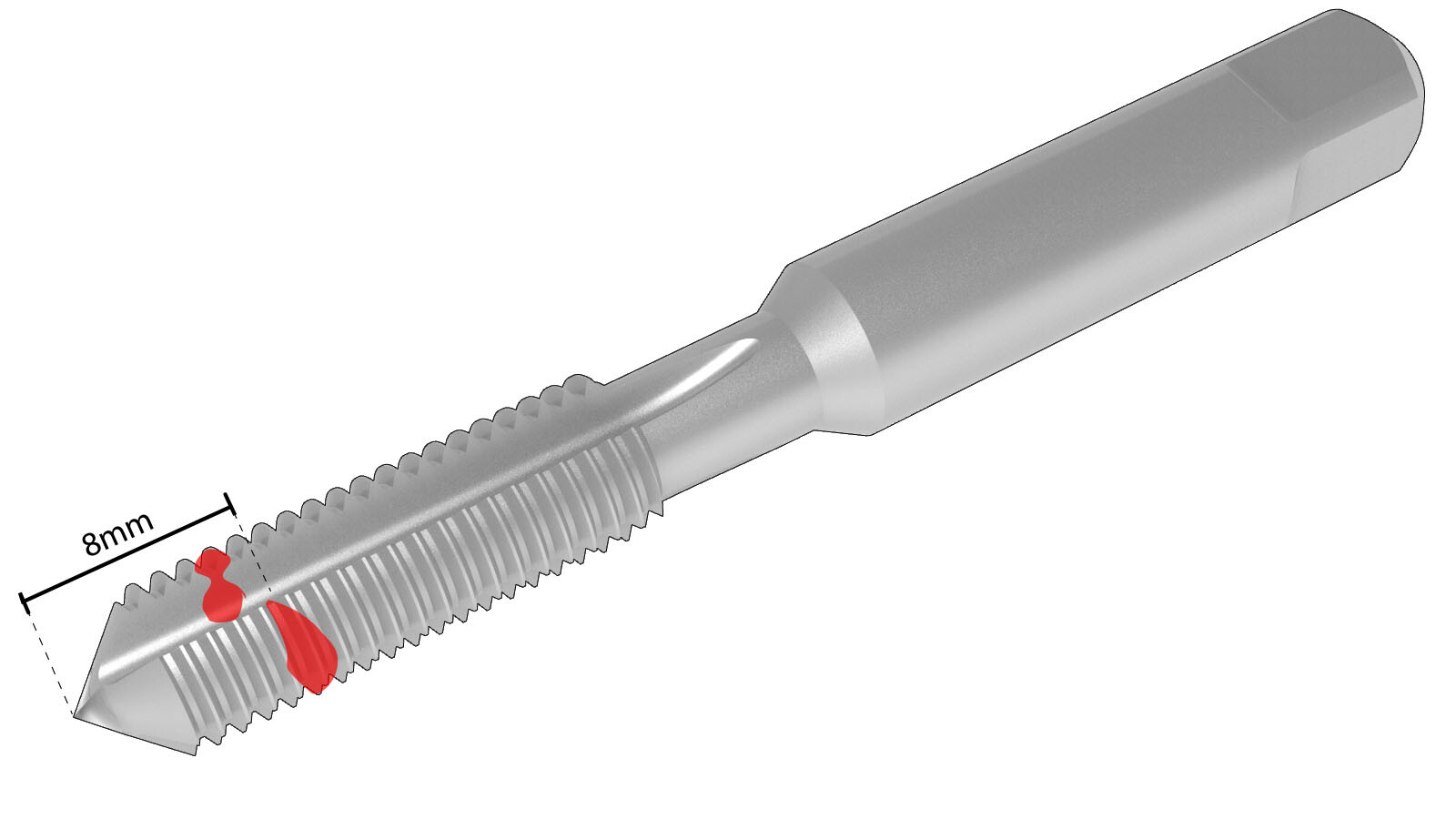 - Measure 8 mm from the tip of the 4mm0.75 tap, and then use a paint pen to mark a ring around the threads of the tap.