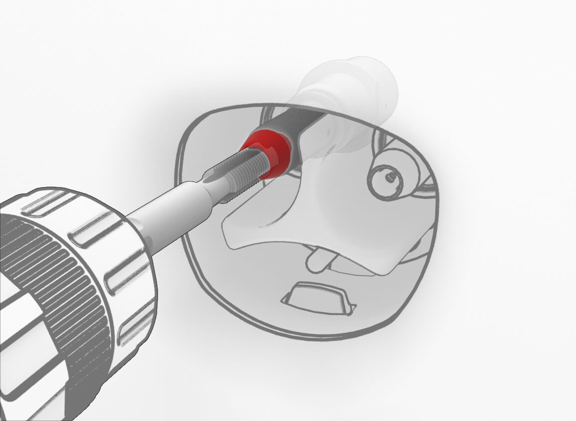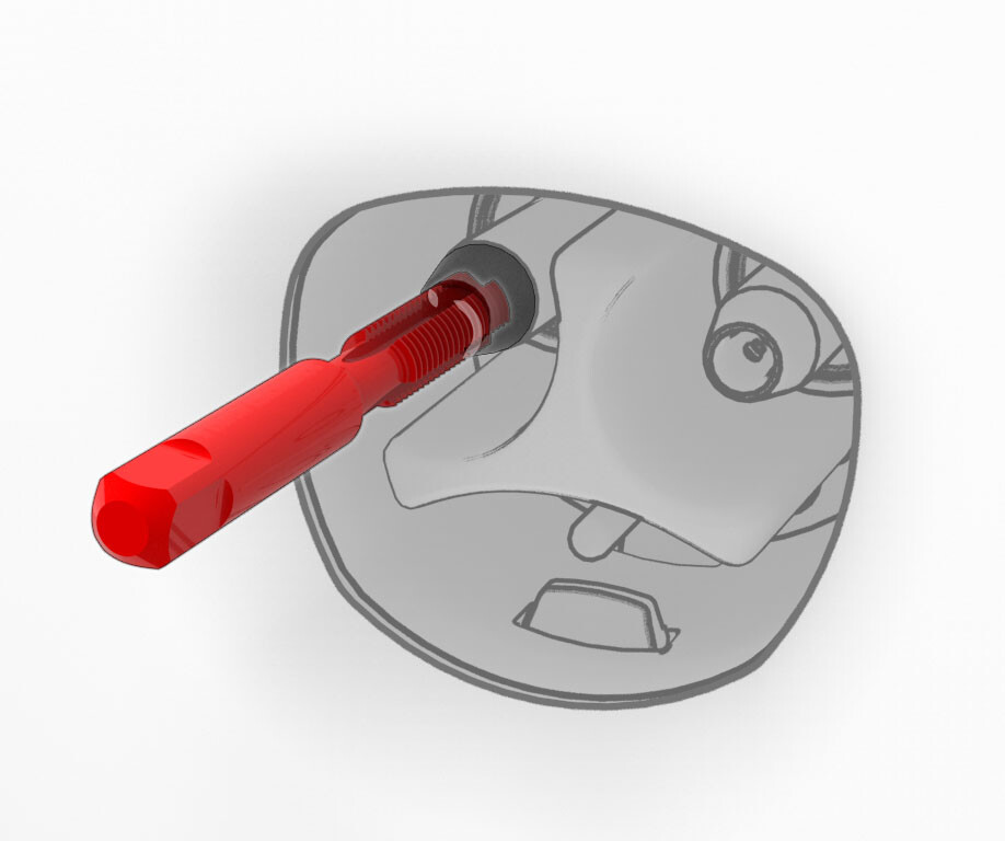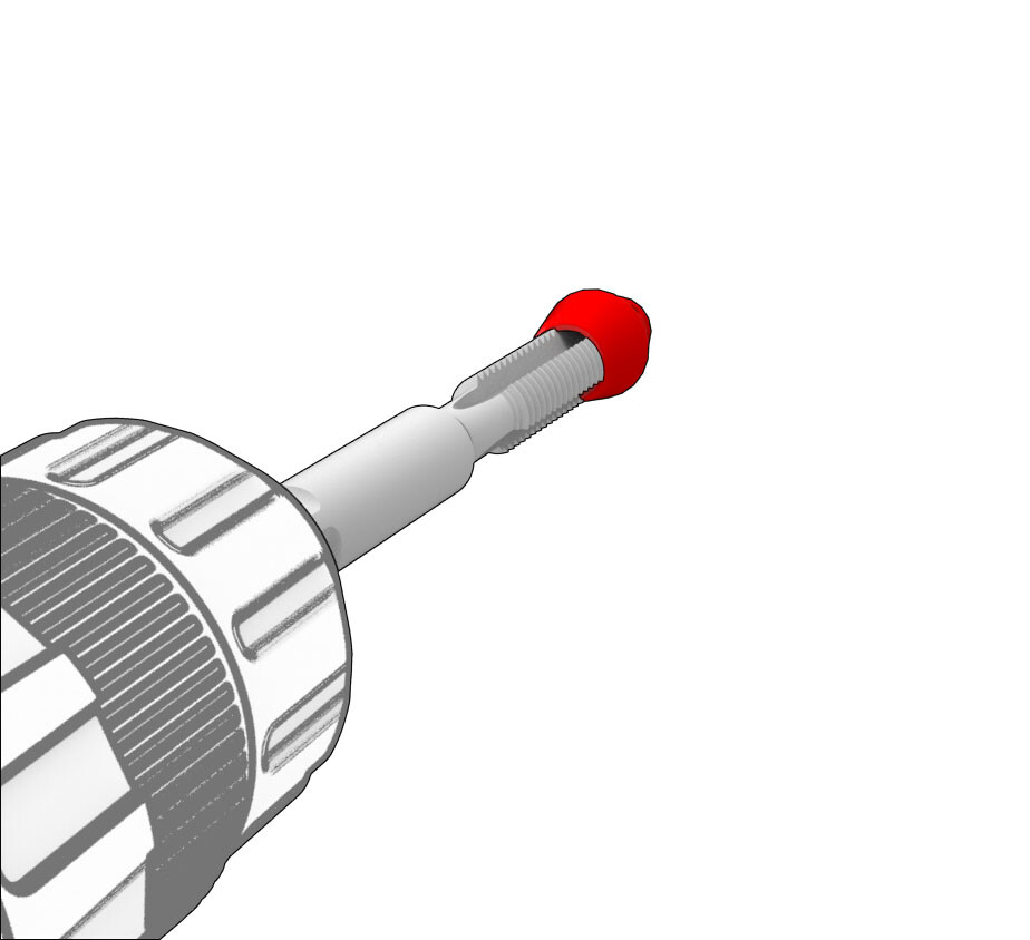 - Use right-angle needle nose pliers to prevent the charge port pin deadfront from turning, and then thread the tap into the deadfront, up to the paint mark.