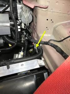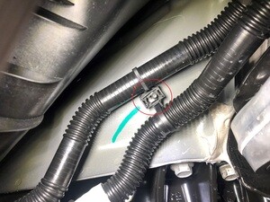 - Remove the coolant hose clip from the 12V battery beam.