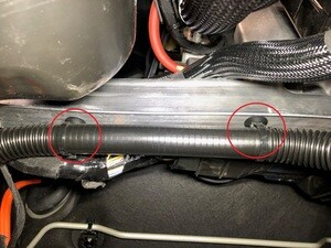 - Remove the coolant hose clips (x3) from the 12V battery beam.