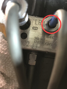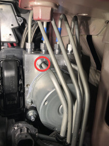 - Remove the nut that (torque 16 Nm) that attaches the LH rear brake line tube to the ABS unit.