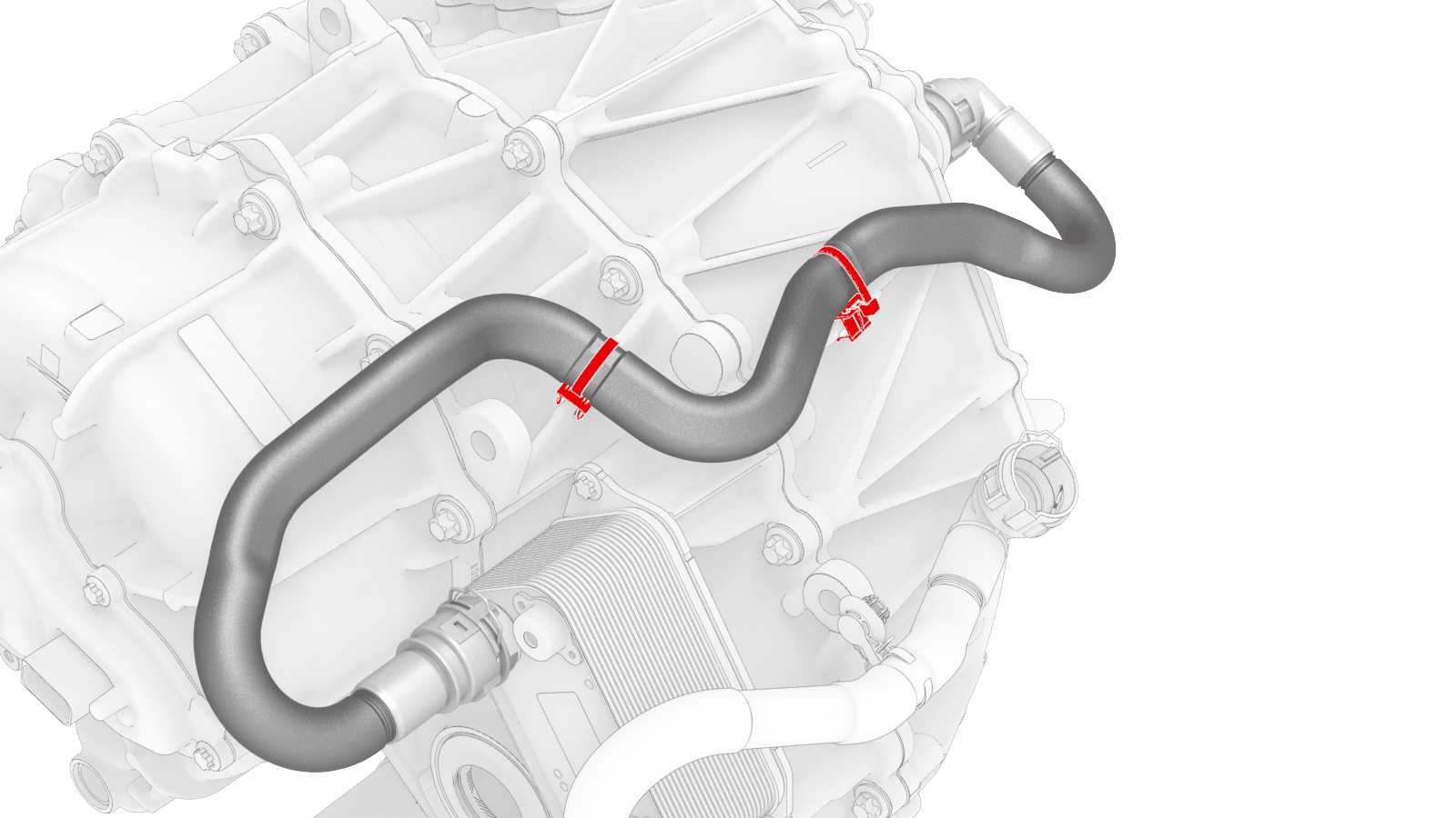 - Bring the front drive unit inverter-heat exchanger hose to the exterior of the front drive unit, and then fasten the clips that attach the hose to the front drive unit.