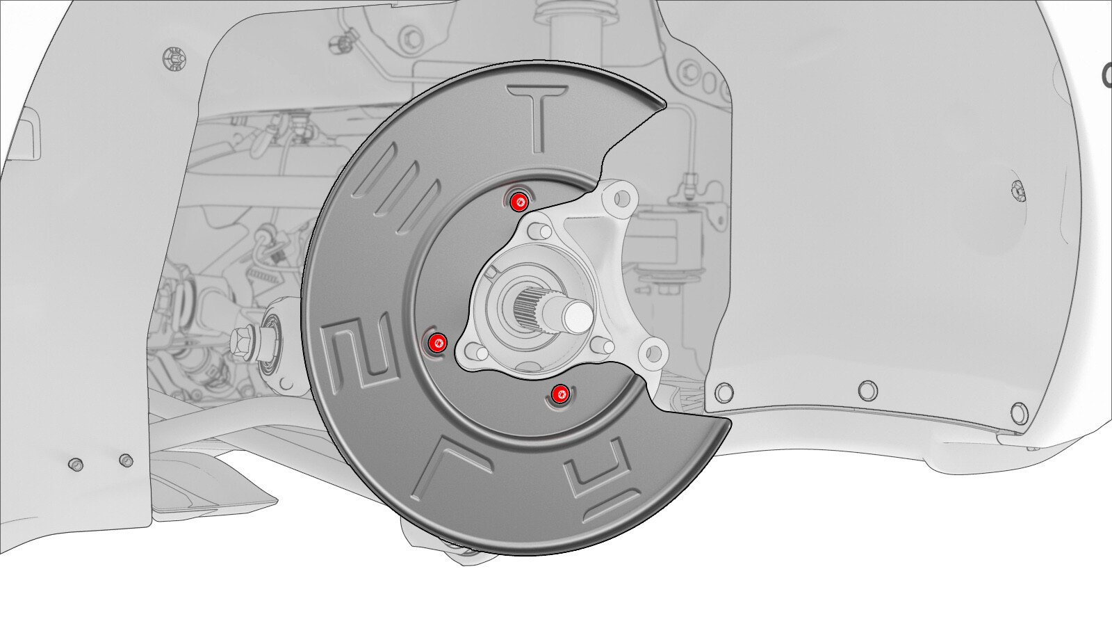 - Remove the bolts (x3) that attach the LH rear brake dust shield to the knuckle, and then remove the dust shield from the vehicle.