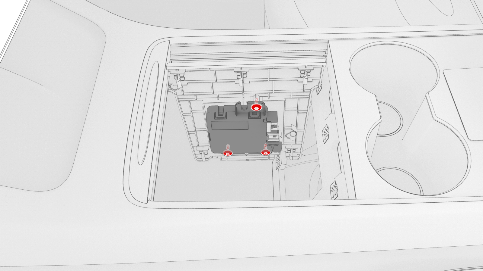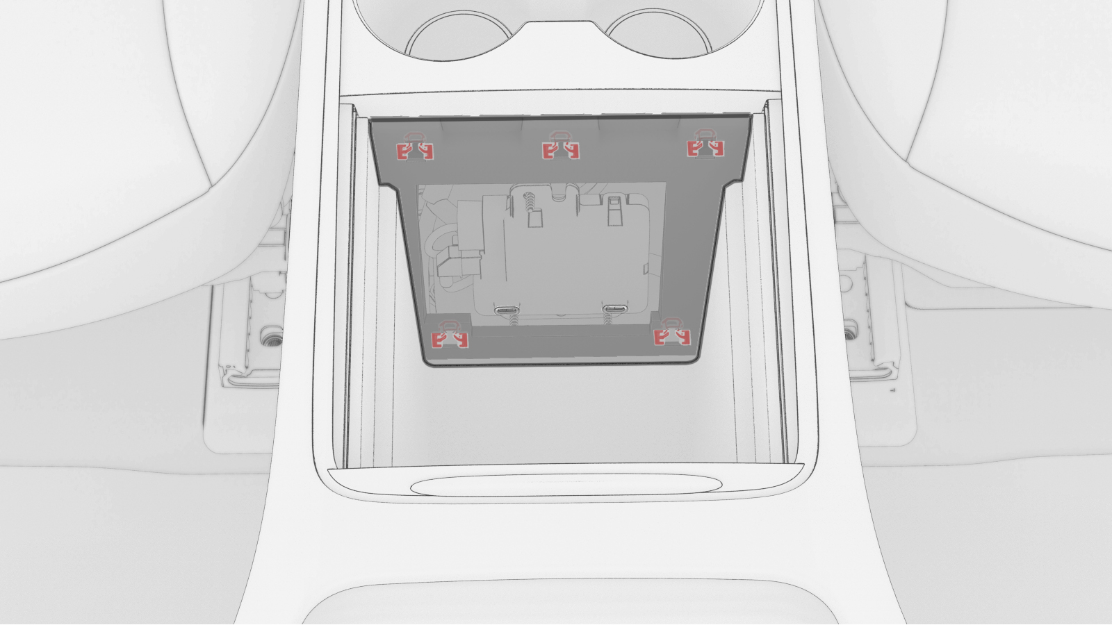 - Move the USB hub to the rear of the center console, and then fasten the clips (x5) that attach the USB hub to the rear of the center console.