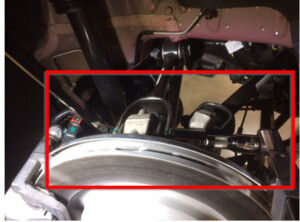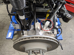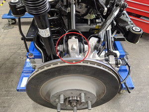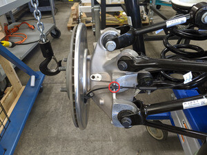 Remove LH rear brake caliper from LH rear knuckle and hang from body
