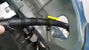 - Route the front harness through the LH fender support, and secure the harness to the fender support.
